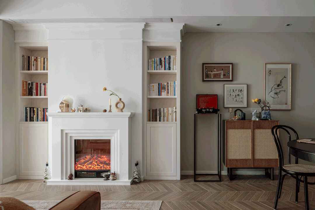 壁炉和书柜的设想替代了电视墙的设想,并且还融入了不少分歧特色的元素。